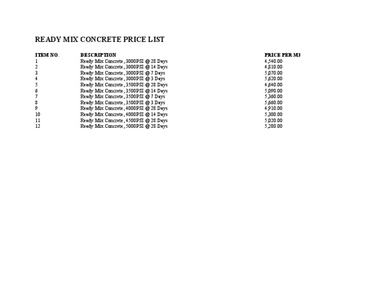 Ready Mix Concrete Price List PDF